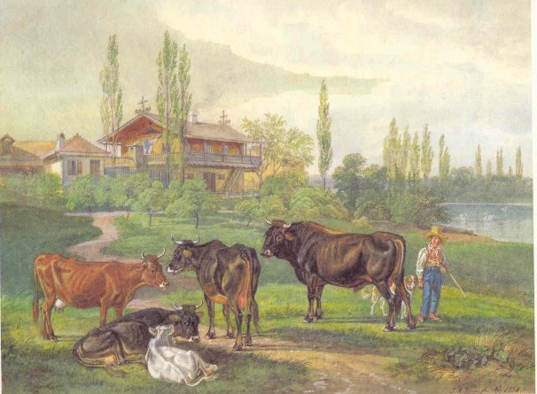 Die Rosenau bei Nürnberg. 1834. Es handelt sich um die Gegend des vormaligen Bleichersweihers, der im Besitz des Deutschen Ordens befindlichen Deutschherrnbleiche. In der ersten Zeit des 19. Jahrhunderts erwarb diesen Komplex der Nürnberger Kaufmann J. D. Wiss und ließ hier einen eigenartigen Vergnügungspark einrichten, ein ausgesprochenes Produkt der Romantik. Da gab es außer einem kleinen "Schweizerhaus" (das auf dem Aquarell wiedergegeben ist) als besondere Attraktion ein von Prof. Karl Alexander Heideloff "nach orientalischen Architekturstudien und eigenen Kompositionen" erbautes maurisches Landhaus. Natürlich durfte ein Restaurant nicht fehlen, ja man konnte in den 1830er bis 1850er Jahren ein Abonnement zum Besuch der Rosenau nehmen, die, wie ein zeitgenössischer Werbeprospekt behauptete, "ein Sammelplatz des guten Tones" war. 1855 wurde die Anlage von König Max II. und Königin Maria von Bayern besichtigt. |